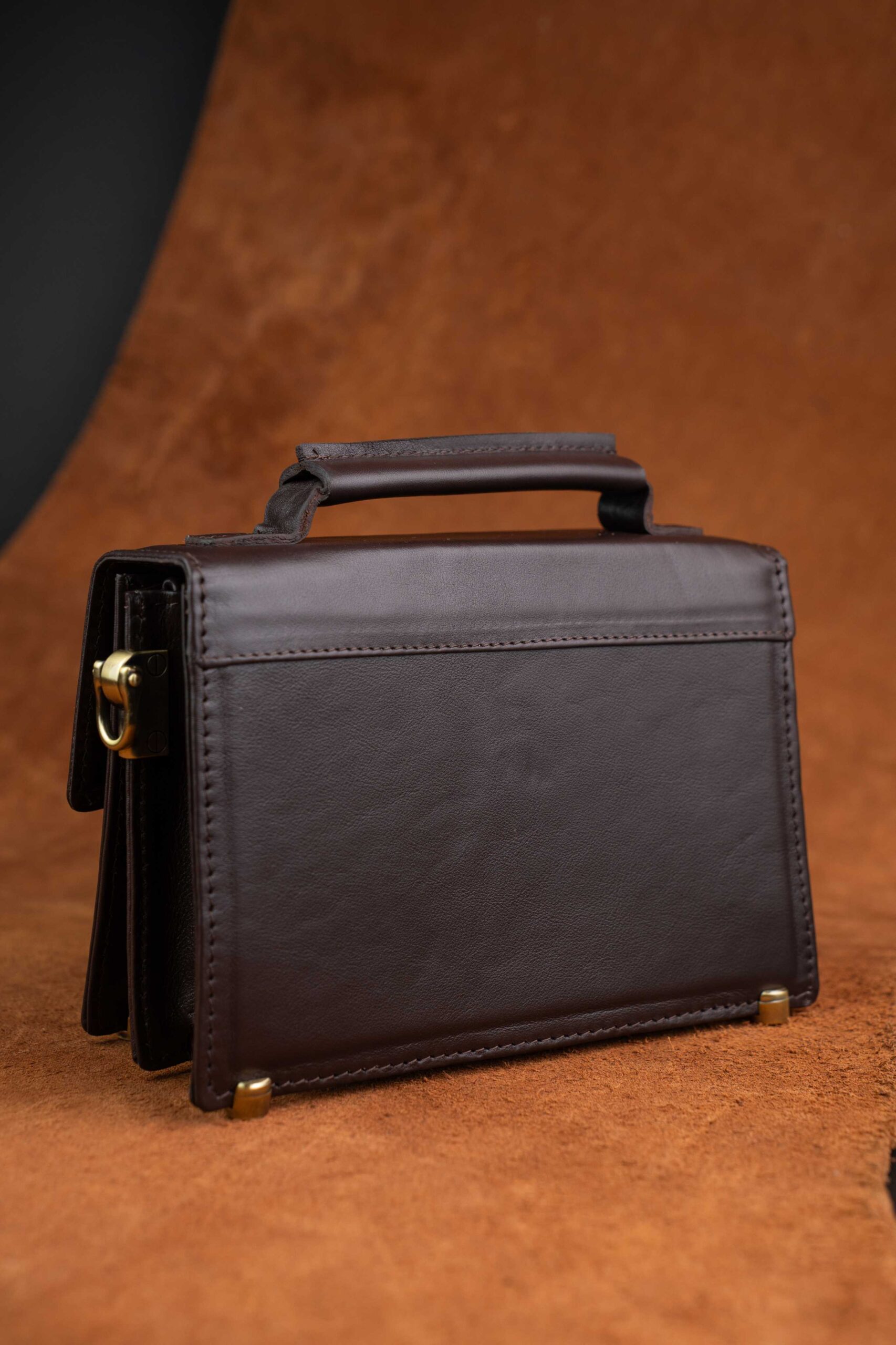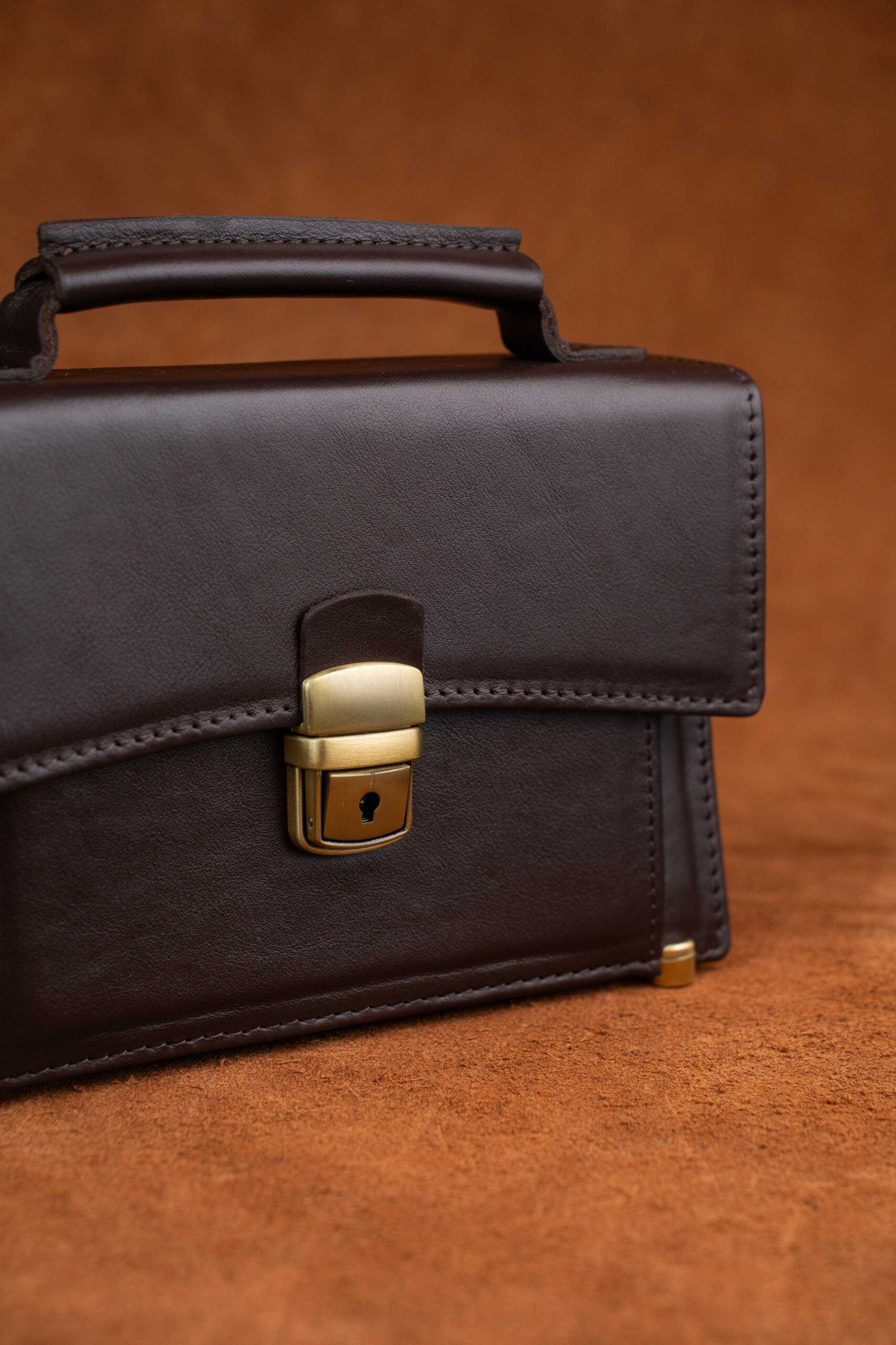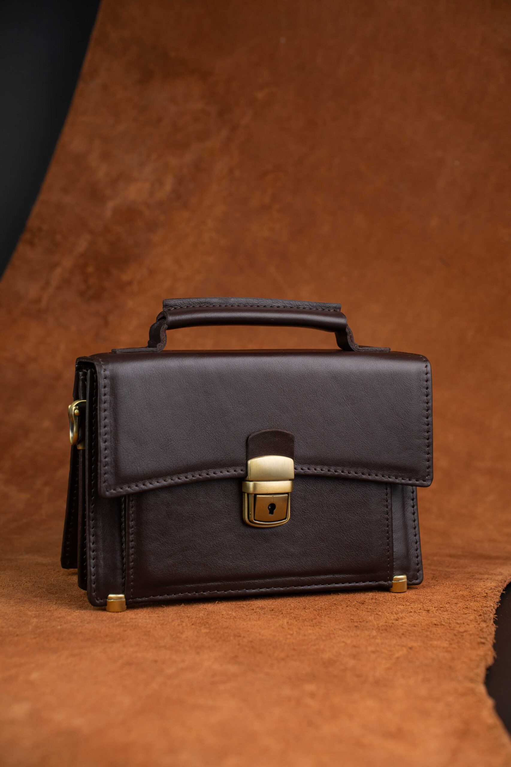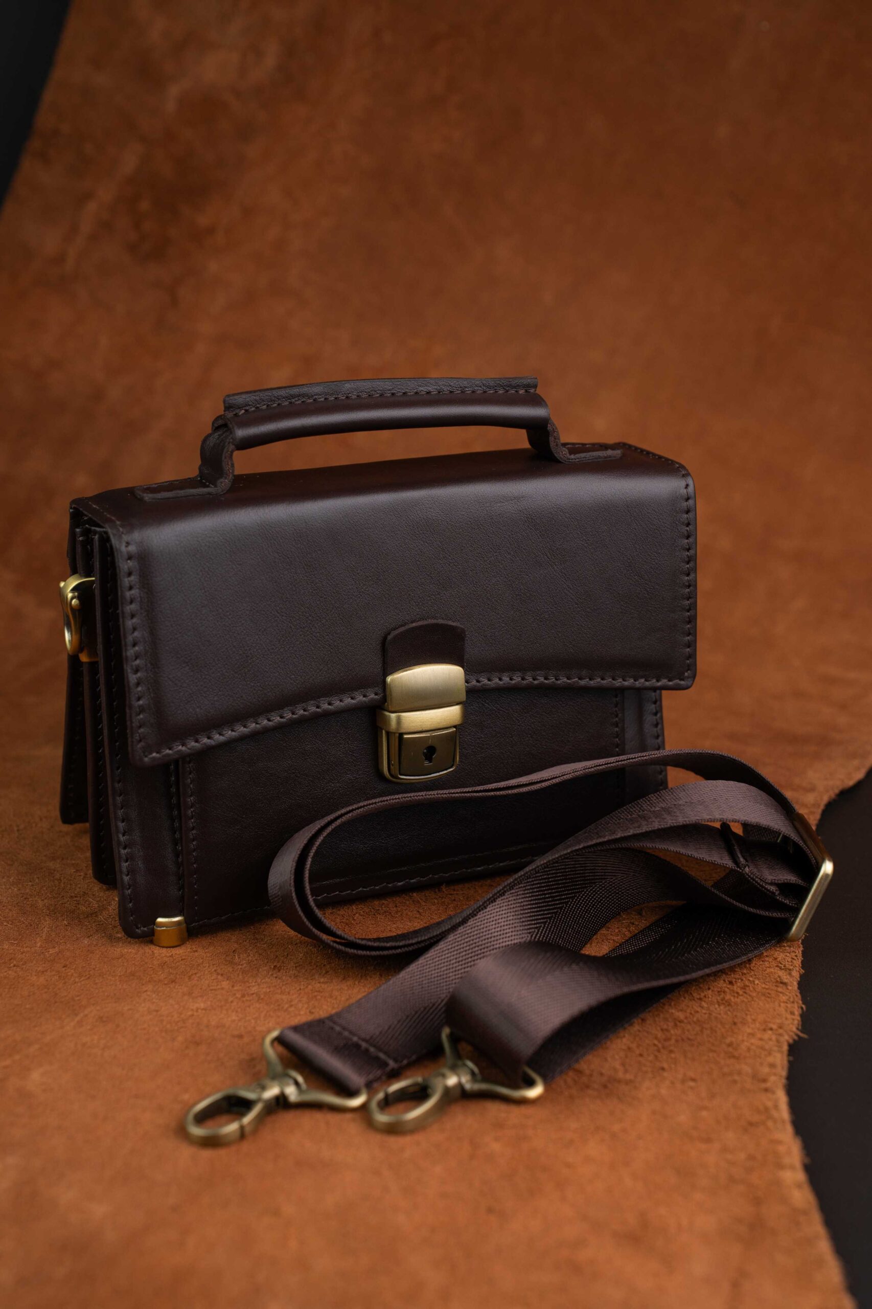 Мужская сумка 816-2-2 — статусный аксессуар из натуральной кожи от белорусского бренда REMBAY. Коричневый цвет, жёсткая форма, металлические акценты и замок с ключевым элементом подчёркивают вкус и уверенность владельца. Идеальна для деловых встреч, подарка и ежедневного использования. Стиль без компромиссов.