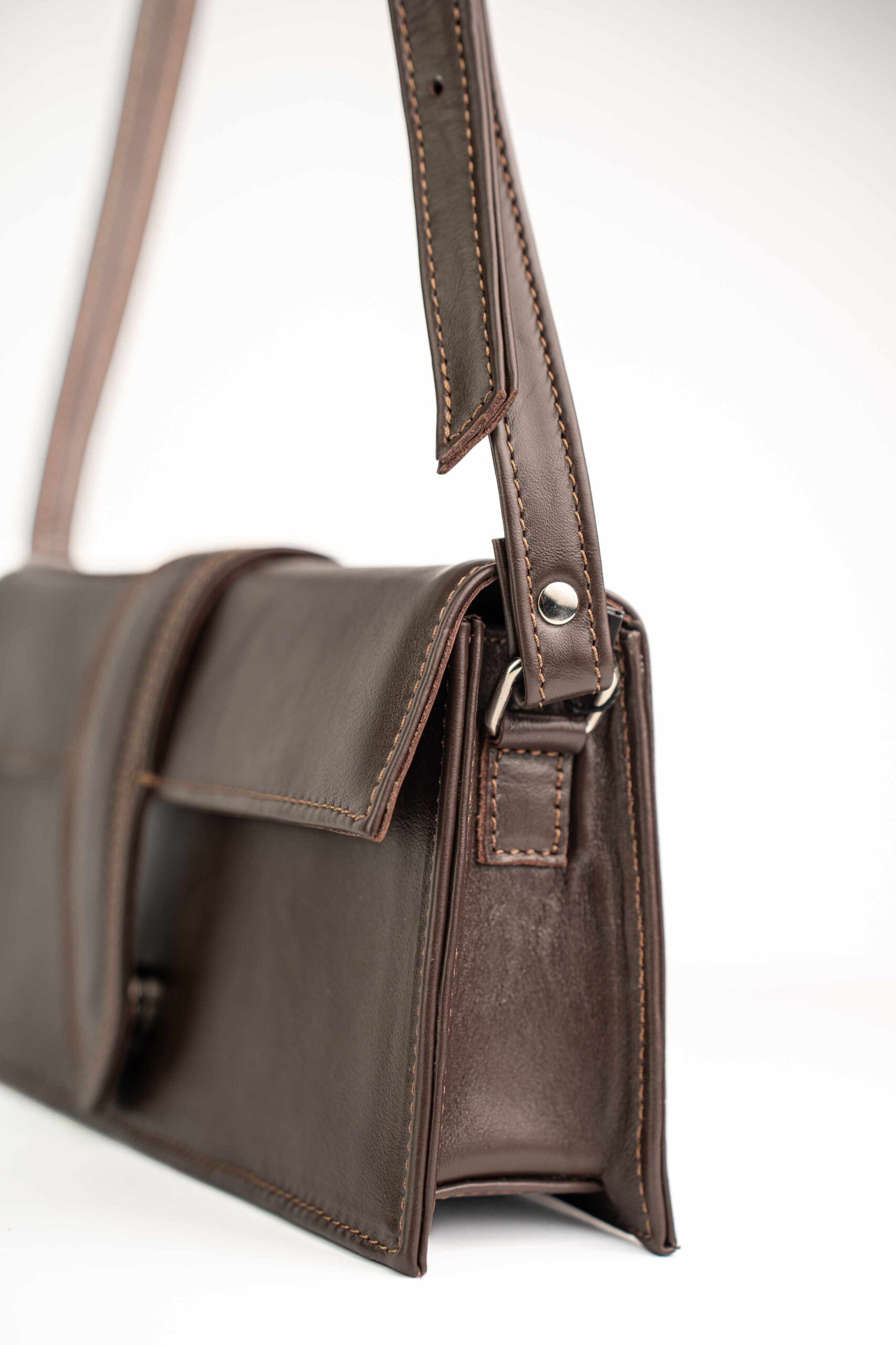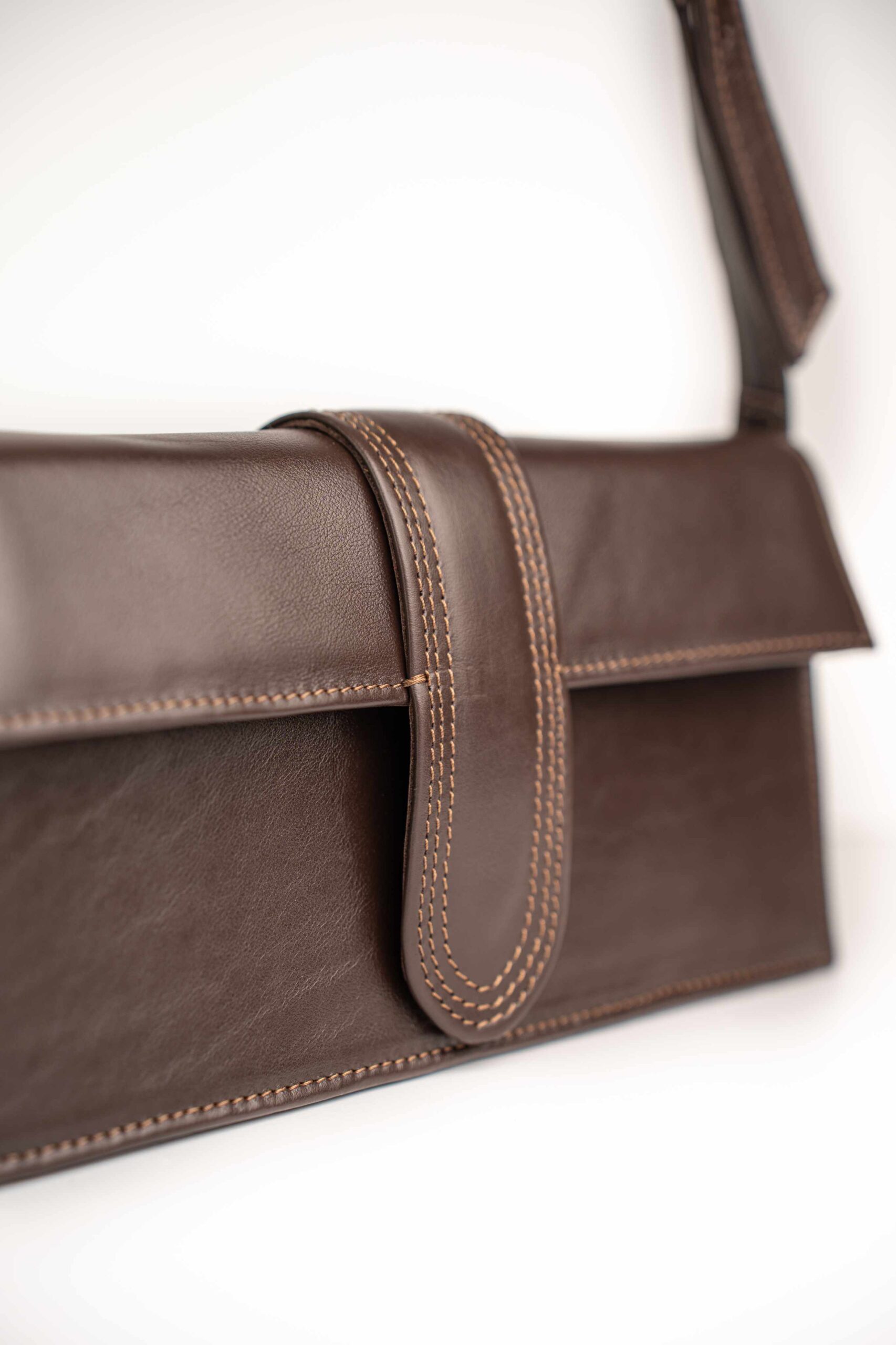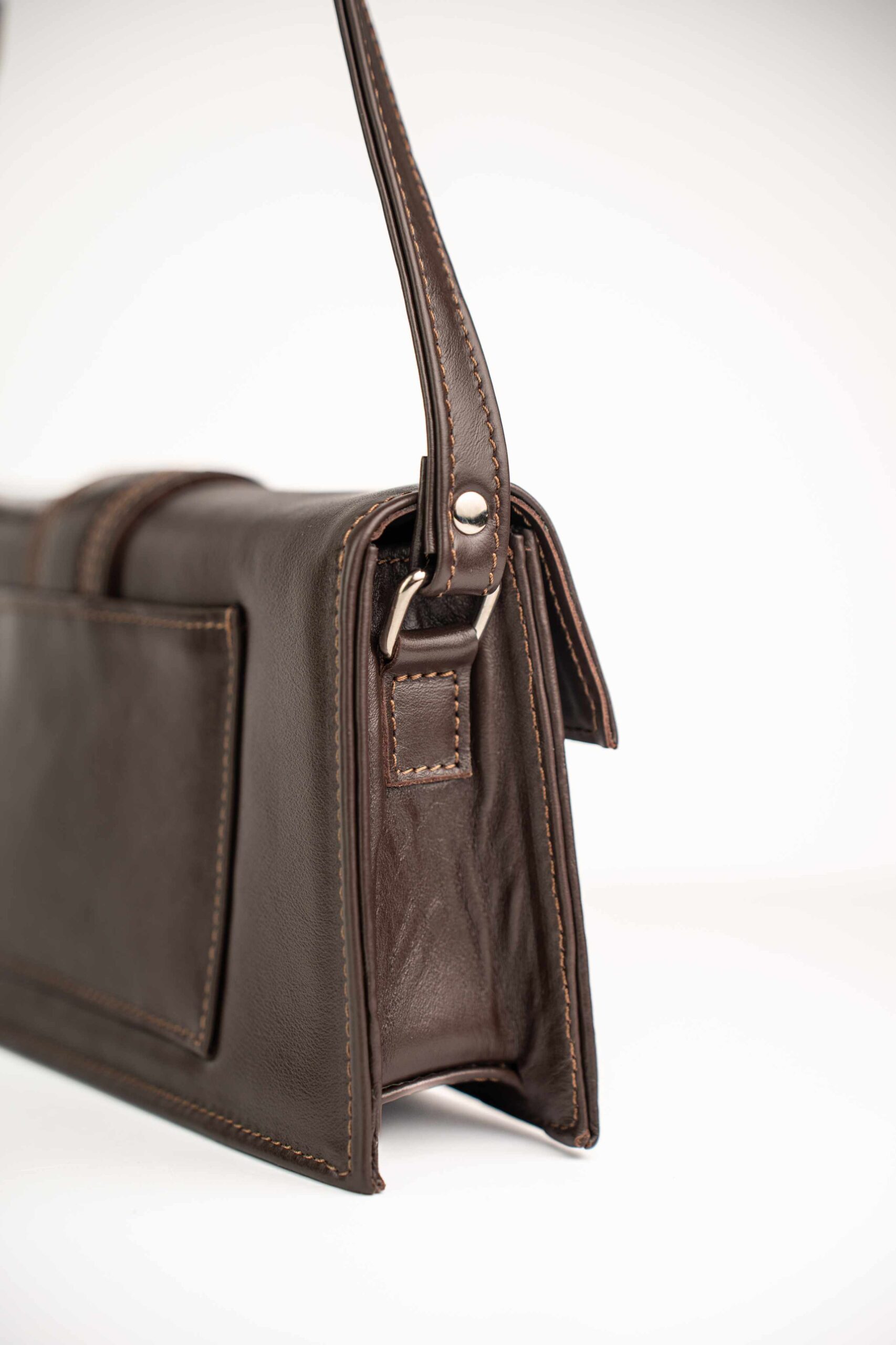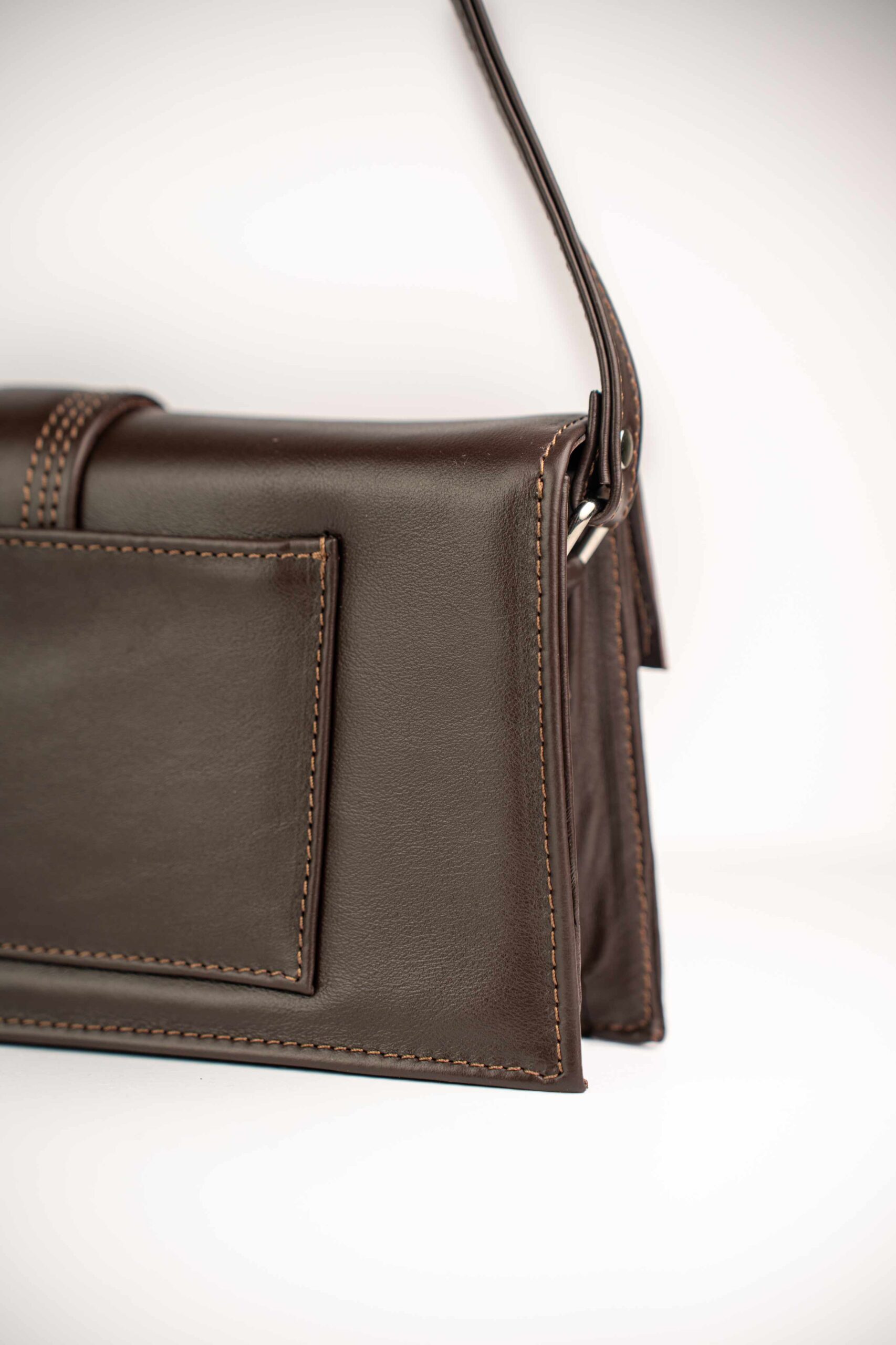 Сумка имеет прямоугольную форму, аккуратную внешнюю отделку и надёжную фурнитуру. Внутреннее отделение удобно для хранения телефона, документов и других необходимых вещей. Благодаря компактному размеру и продуманной конструкции, модель подходит для города, работы и прогулок.