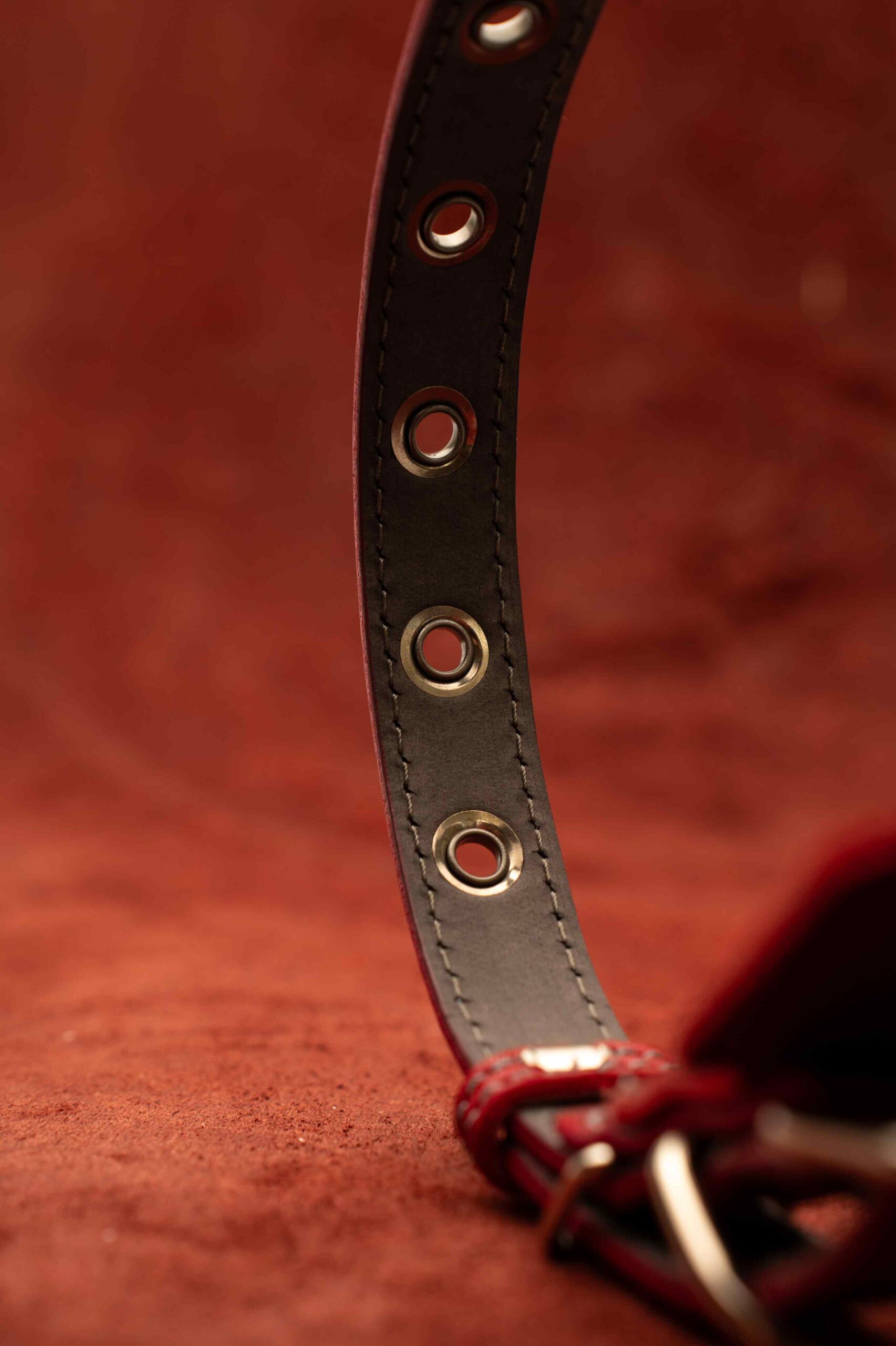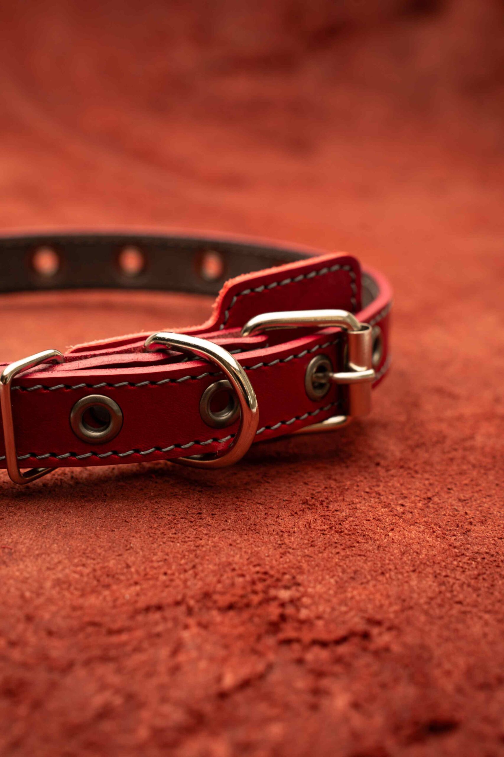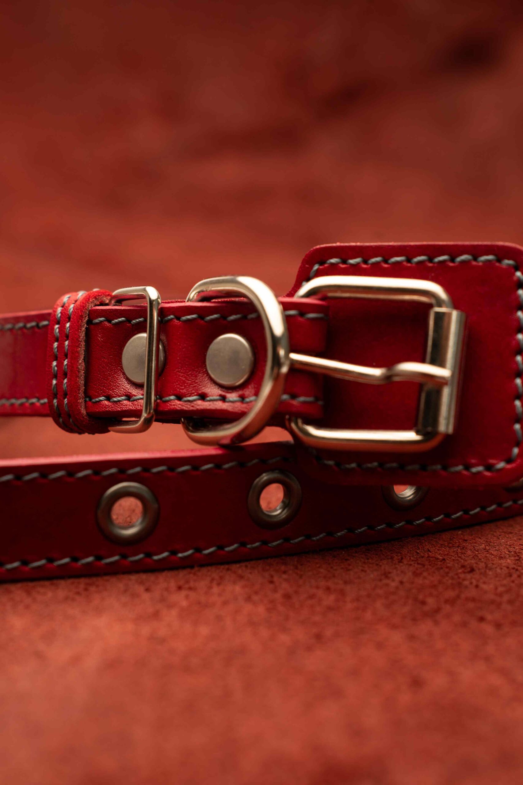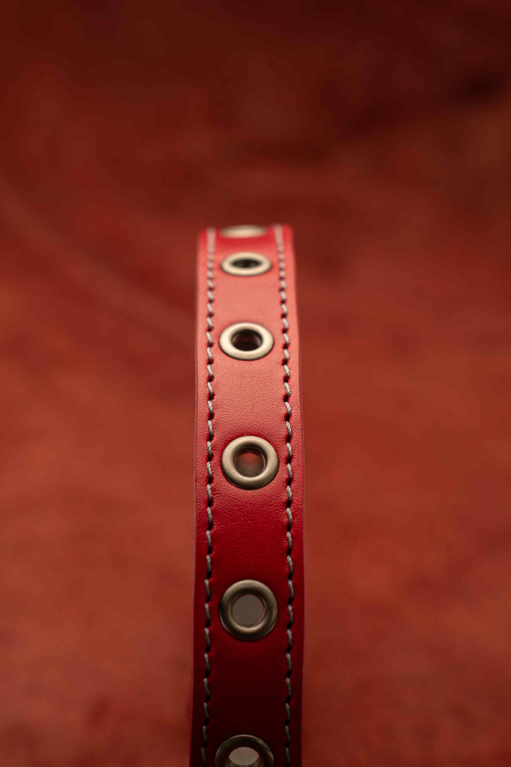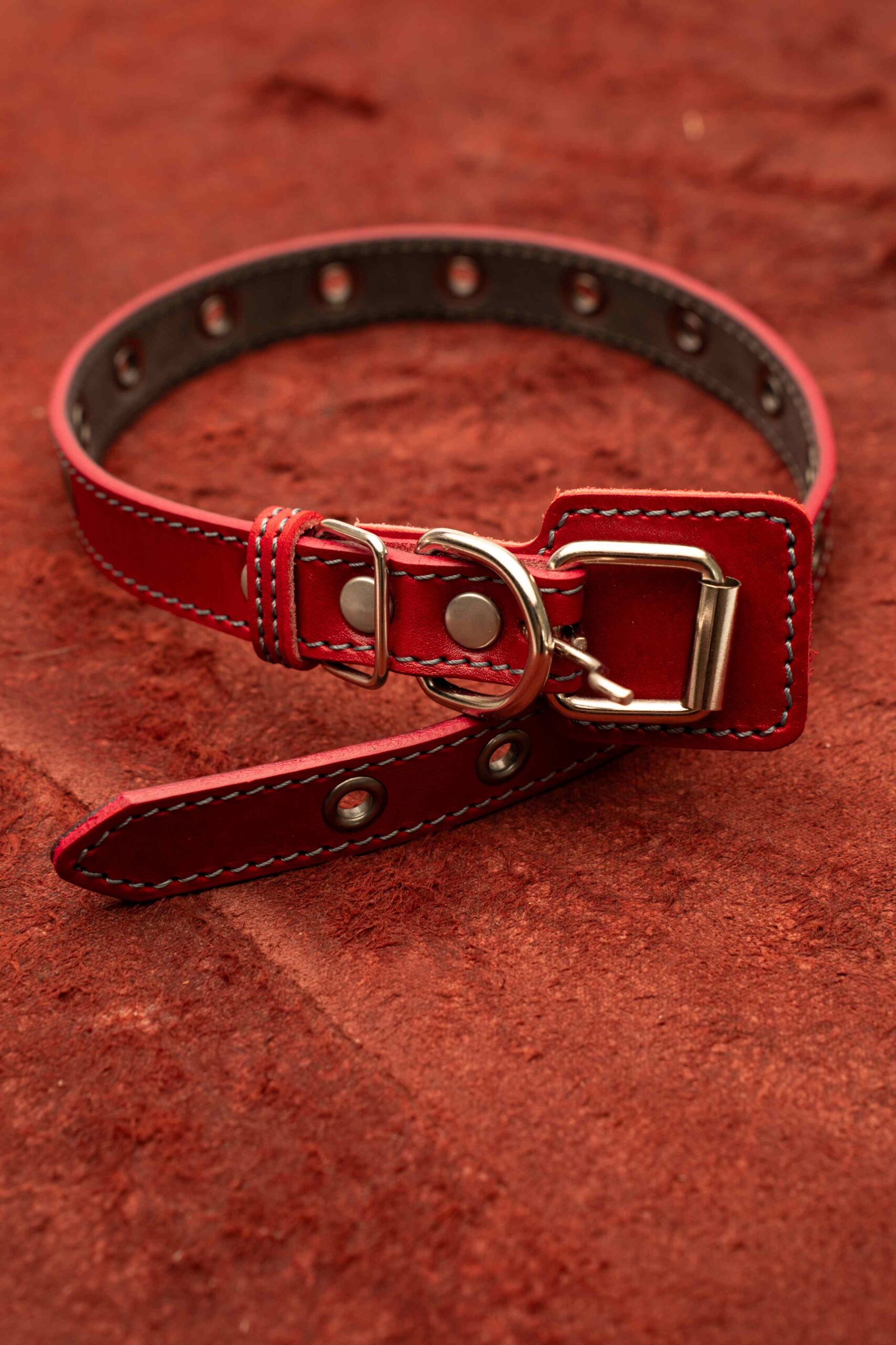 Ошейник кожаный для собак 20 мм, длина 50 см, красный цвет с серой строчкой, 14 люверсов.