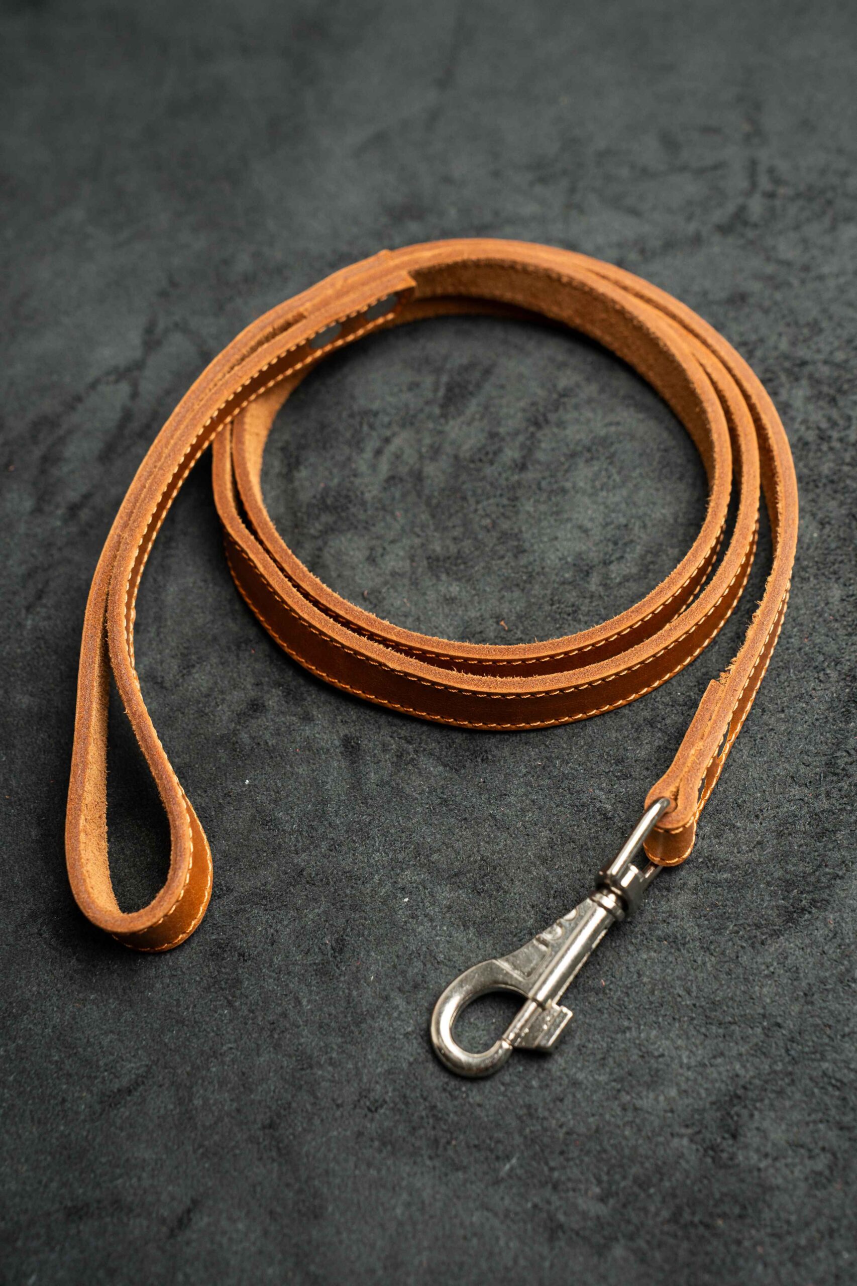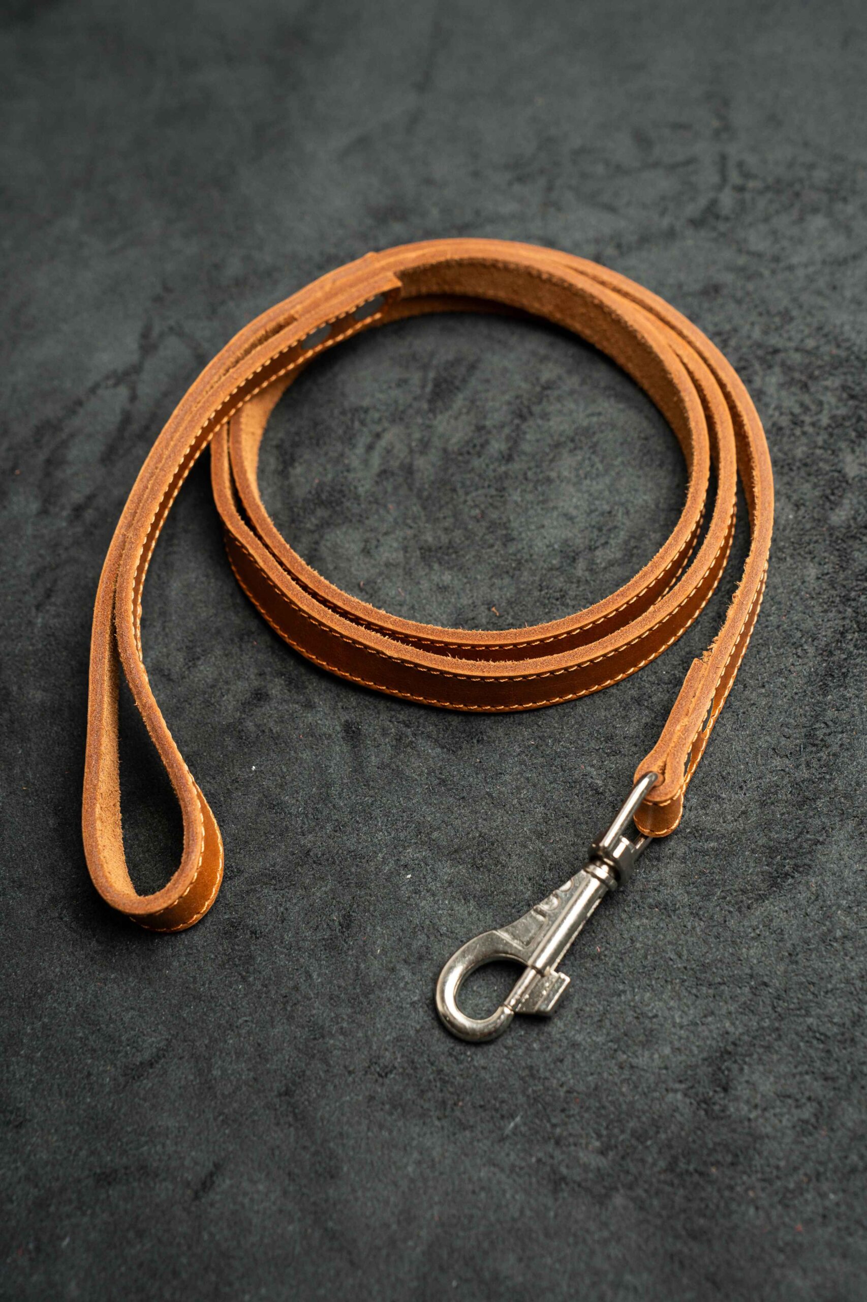 Поводок из натуральной кожи шириной 1,2 см и длиной 120 см — надежный аксессуар для прогулок. Светло‑коричневый цвет «коньяк» дополнен выразительной рыжей строчкой, подчеркивающей стиль и качество изделия.